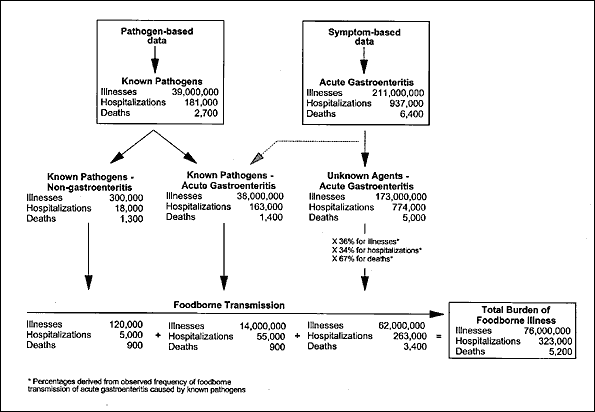 More than 200 known diseases are transmitted through food (1). The causes of foodborne illness include viruses, bacteria, parasites, toxins, metals, and prions, and the symptoms of foodborne illness range from mild gastroenteritis to life-threatening neurologic, hepatic, and renal syndromes. In the United States, foodborne diseases have been estimated to cause 6 million to 81 million illnesses and up to 9,000 deaths each year (2-5). However, ongoing changes in the food supply, the identification of new foodborne diseases, and the availability of new surveillance data have made these figures obsolete. New, more accurate estimates are needed to guide prevention efforts and assess the effectiveness of food safety regulations.